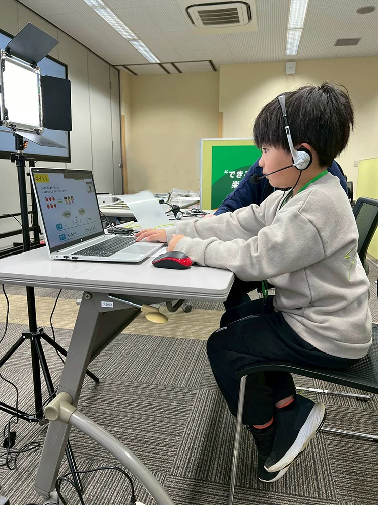 - 原稿の読み方を練習し、カメラの前で撮影、編集したあと、保護者の方と一緒に動画を視聴します。