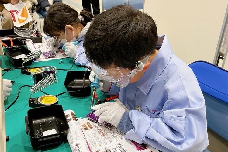 - “はんだごて”を使って電子部品をはんだ付けし、光センサーアボイドカーを組み立てます。