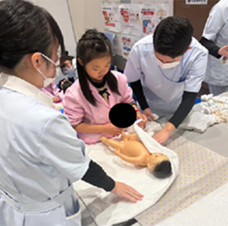 看護師として、赤ちゃんのお世話をする沐浴法と急病者の対応をする救急法を体験します。