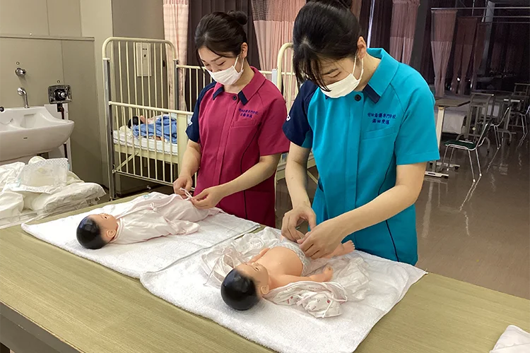 赤ちゃんの健康状態のチェックとして、心音・肺音・腸音を聴き、血圧の測定を行います。その後、沐浴を行い、きれいな産着に着替えさせます。
