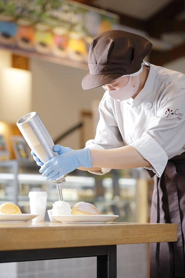 パンケーキの焼き方を学んだあと、季節のフルーツを使ってパンケーキにトッピングを行い、季節限定メニューを開発します。