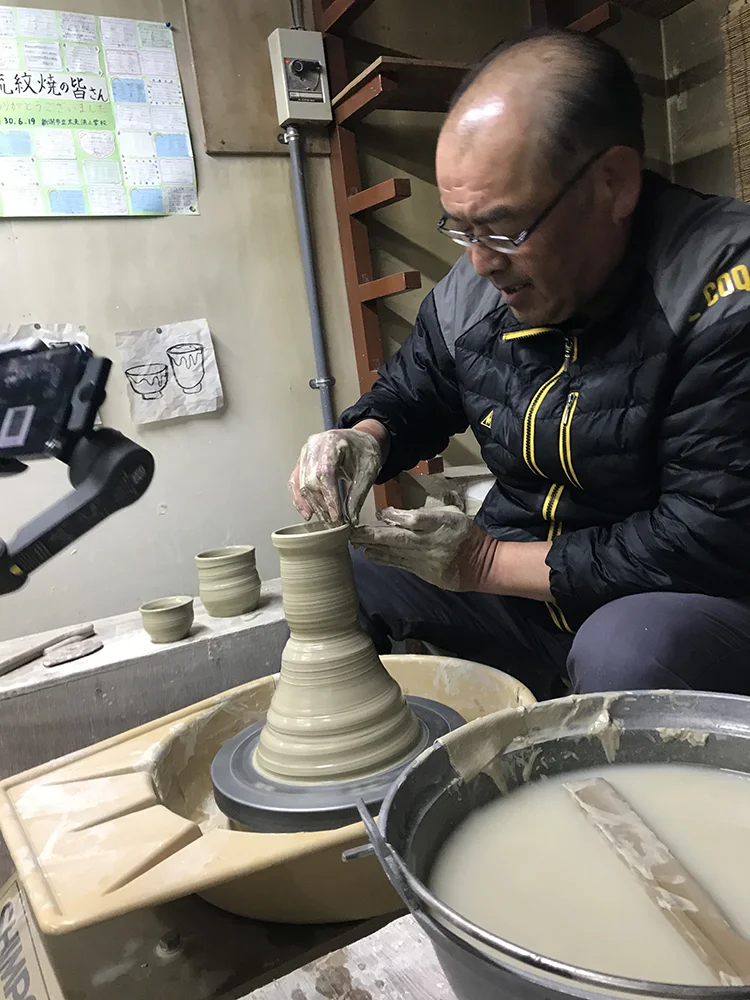 - 粘土から形を作り、うわぐすりをかけ、窯に積みます。