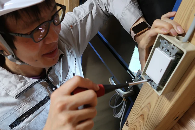 図面を確認して電線を配線し、スイッチやコンセントを取り付けます。